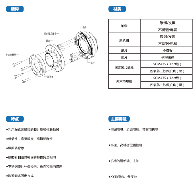 DFPS-T系列聯(lián)軸器采用碳鋼發(fā)黑,利用脹緊套聯(lián)接的膜片型彈性聯(lián)軸器,廣泛用于伺服電機(jī)、步進(jìn)電機(jī)、精密電機(jī)等。