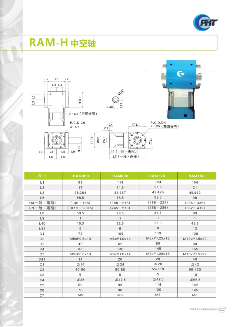 RAM-H系列是中空軸設(shè)計(jì)。 鋁合金材質(zhì)可提高散熱能力,減緩溫升現(xiàn)象造成影響。 多樣化的出力軸可因應(yīng)各種場(chǎng)合,客制化的入力端可搭配各式馬達(dá)。 提供各式特色之減速機(jī),供使用者依需求選購(gòu)。 特殊油封設(shè)計(jì),正常使用下不需保養(yǎng)亦不用更換潤(rùn)滑油,可延長(zhǎng)使用壽命。 各式特色,體積小,省空間,噪音低,輸出扭矩高,安裝容易,可搭配馬達(dá)型號(hào)廣泛。 RAM搭配DM,一體成型的齒輪組,可有效的減低噪音。 RAM搭配DH,最佳的性價(jià)比,可廣泛應(yīng)用于各種場(chǎng)合。