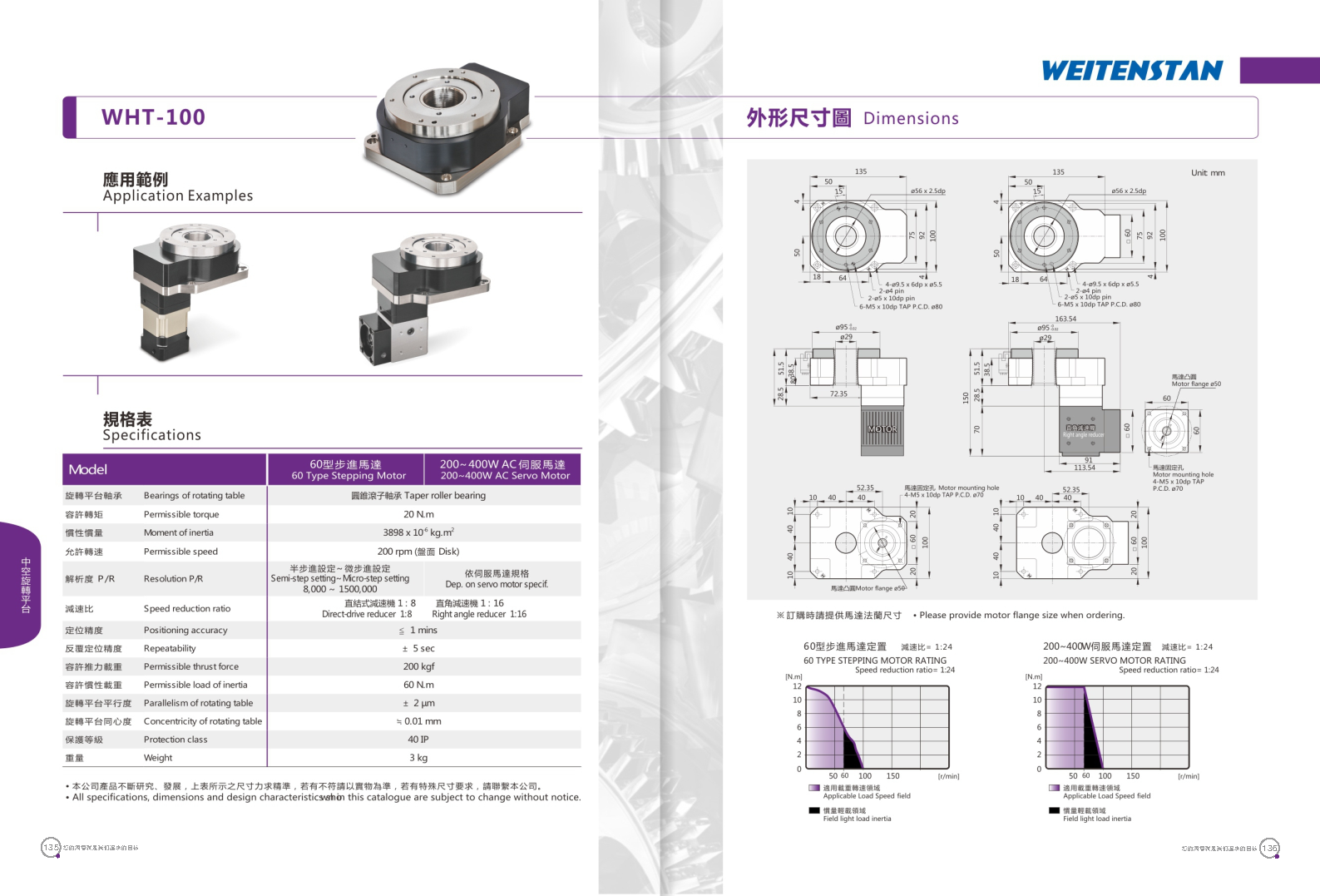 WHT系列中空旋轉(zhuǎn)平臺。 具有優(yōu)異定位精度與重復(fù)精度的中空旋轉(zhuǎn)平臺,可搭配使用伺服馬達(dá)或步進(jìn)馬達(dá),展現(xiàn)獨(dú)特的性能可靠度。 工作物可直接鎖固。旋轉(zhuǎn)盤面可直接鎖固工作物,提升工件裝載之方便性。 配線方便。此旋轉(zhuǎn)平臺為中空式設(shè)計(jì),無論是配線或配管均方便。 高精度。定位精度小于1分。重復(fù)精度可達(dá)±5秒。 運(yùn)轉(zhuǎn)動作平穩(wěn)。盤面轉(zhuǎn)動平穩(wěn),順暢,且定位快速。 適用各種馬達(dá)。中空旋轉(zhuǎn)平臺可采用各種廠牌之伺服馬達(dá)或步進(jìn)馬達(dá)驅(qū)動。