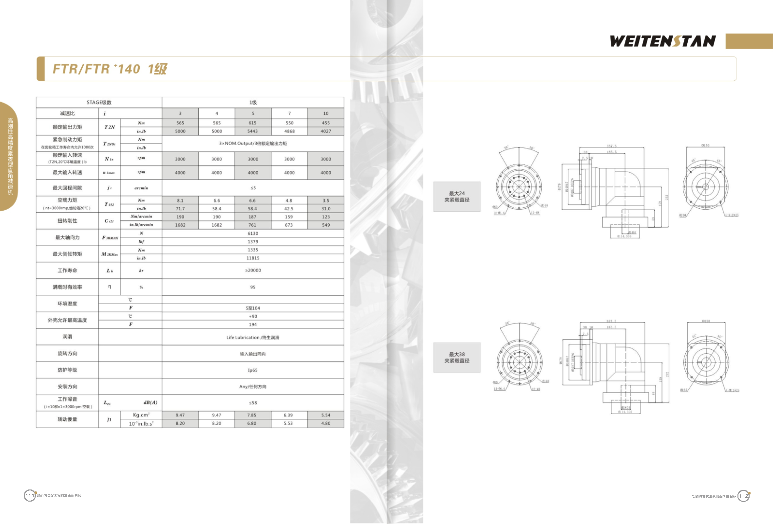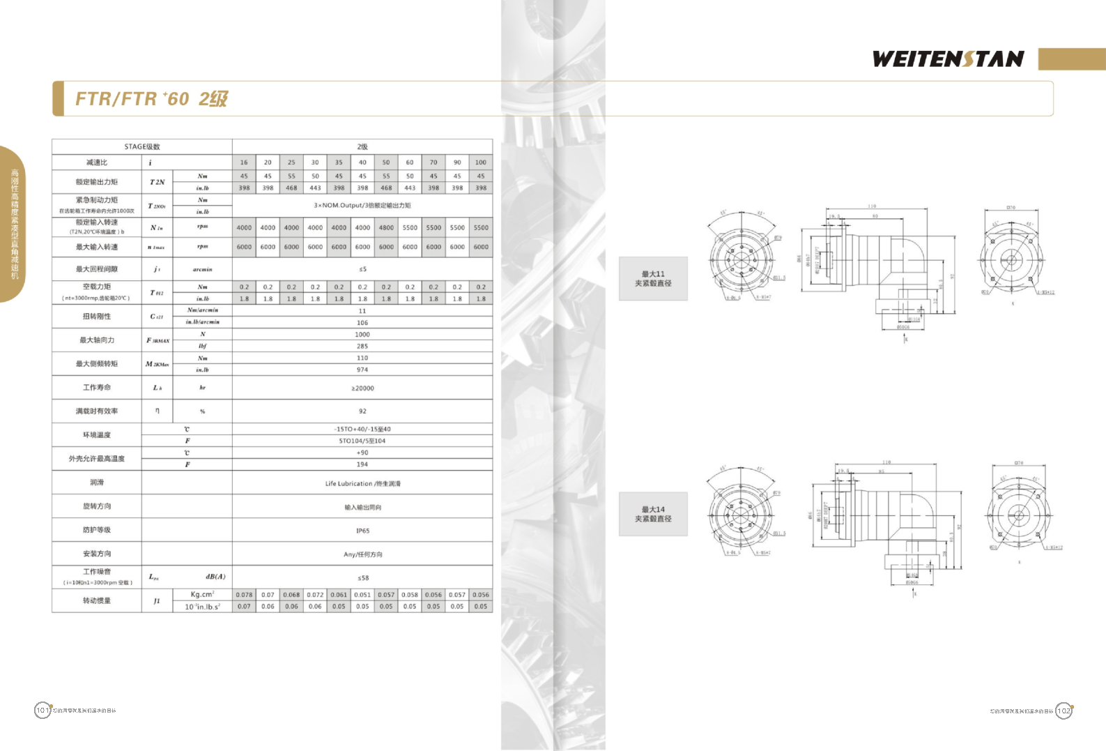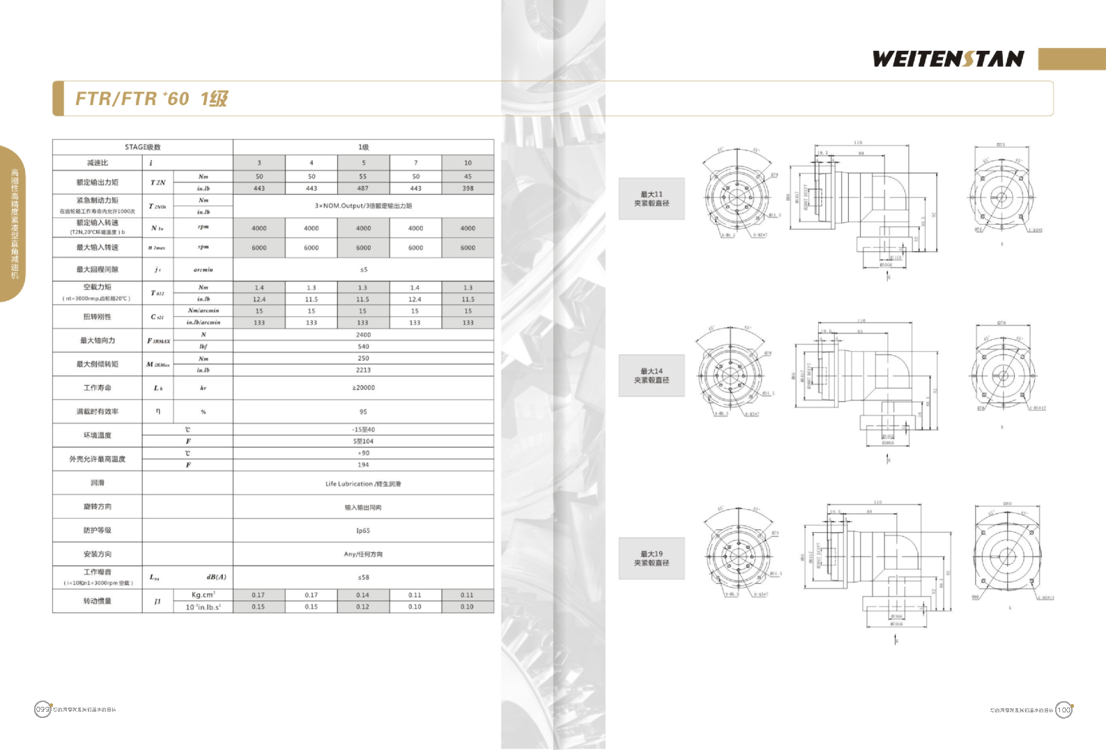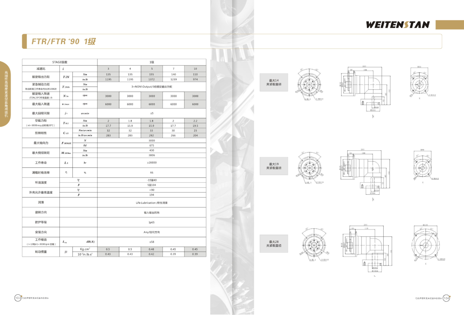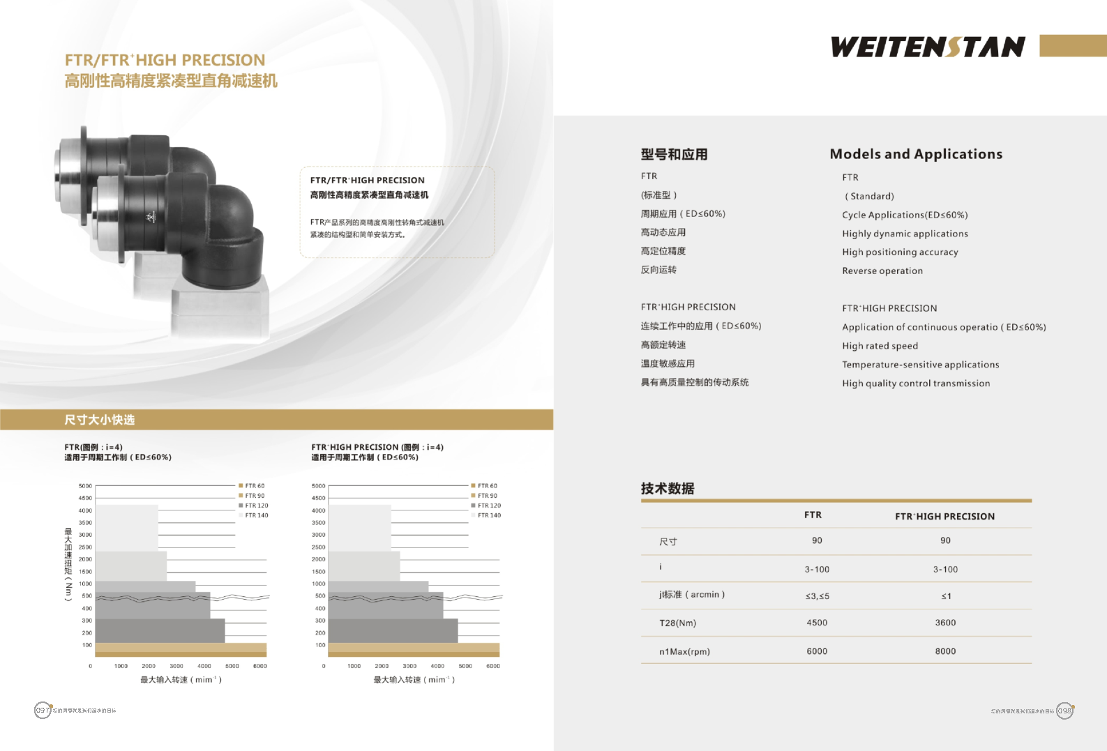 FTR系列高剛性高精度緊湊型直角減速機。 FTR產(chǎn)品系列的高精度高剛性轉(zhuǎn)角式減速機。緊湊的結(jié)構(gòu)型和簡單安裝方式。 極高的功率密度。盡管以往系列性能極為出色,但我們成功的將扭矩提高了近40%。不斷提高極限值,典型威騰斯坦產(chǎn)品! 電機安裝簡易。電機可安全簡易的一步安裝,另外您也可以選擇威騰斯坦享有的專利權(quán)的,帶有長度補償軸的安裝。 任意位置安裝。不管你在哪個位置安裝,你的齒輪箱始終有相同的潤滑油/潤滑脂量。安裝靈活、齒輪箱能夠垂直、水平、與從動軸一起向上或向下安裝。 極高的定位精度。根據(jù)用戶需求,你可獲得回程間隙小于角分的高型行星齒輪箱。這也大大提高了你應用上的定位精度。 通過齒輪嚙合,運轉(zhuǎn)平穩(wěn)。相比直齒嚙合齒輪箱,本公司的斜齒嚙合齒輪箱運轉(zhuǎn)噪音減低了50dB-A,你深知50dB-A所創(chuàng)造的價值遠遠高于70dB-A。此外還有:不再感動振動,運轉(zhuǎn)平穩(wěn)到令人驚訝。 世界水平的預期壽命。原材料進行了優(yōu)化,幾何形狀同樣進行了優(yōu)化。